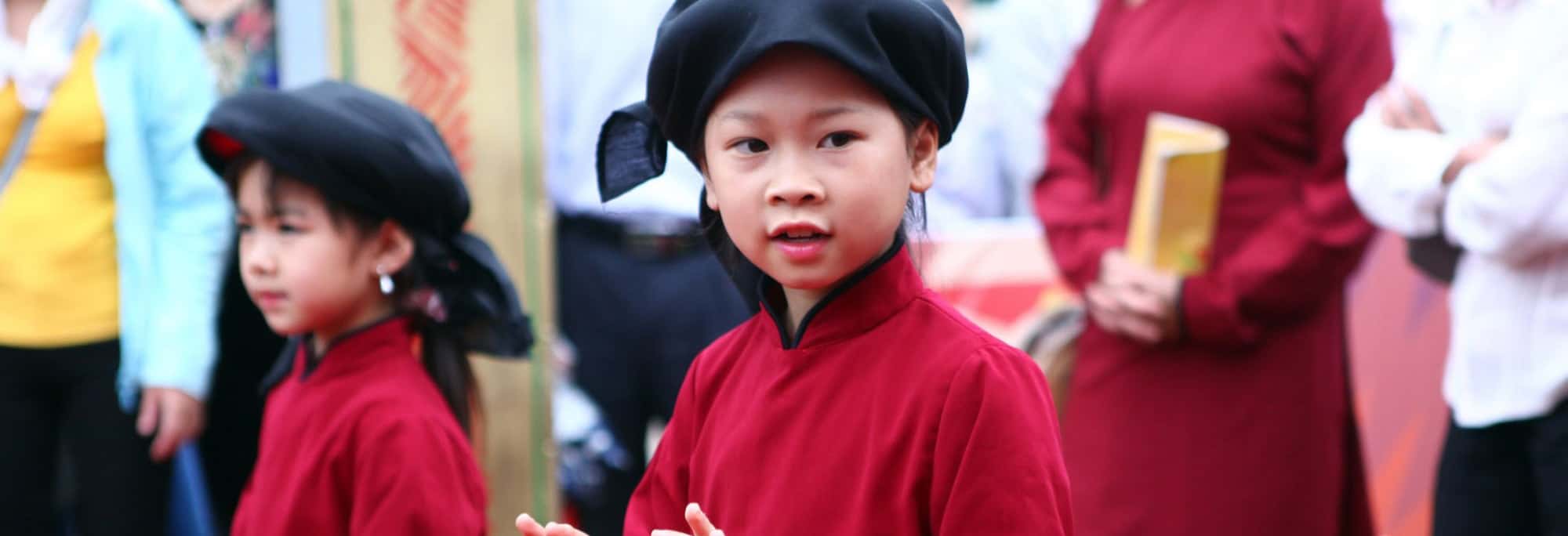 Along with Ca Tru and Quan Ho Folk Singing, Xoan Singing was recognized as an Intangible Cultural Heritage of Vietnam in 2011. The article below which was written by musician Cao Khac Thuy will give readers an overview of this unique and long-standing folk treasure of Vietnam.Xoan singing – an Intangible Cultural Heritage of Vietnam The Origin of Xoan Singing Xoan singing from the villages in the ancestral land of Phu Tho is usually performed in the springtime. Legend has it that, in the era of the Hung Kings, a beautiful lady named To Hoa was famous for her singing and dancing, so the king commanded her to perform for his pregnant wife during her delivery. To Hoa’s beautiful songs and lithe dances eased the queen’s pains and helped her give birth to three sons. The Hung King complimented To Hoa on her virtuosity and asked the princesses to learn to perform like her. This form of dancing and singing became known as “Hat xuan” (Spring Singing) because it was first performed in the springtime. The elders in Phu Duc Commune tell another version of the art form’s origin. It is said that one day when the Hung King traveled to Phu Duc he saw a group of herders playing and singing joyfully so he asked his entourage to teach the children some folk songs. This is considered the origin of Xoan singing and Phu Duc Commune is believed to be the cradle of the art form.The two stories and research into the legends, history, archeology and sociology all confirm that Xoan singing dates back to the Hung Kings era. “Xoan singing itself features a wider variety of traditional cultural rituals than other cultural customs in the northern midland and delta region, such as rituals for worshipping ancestors or national heroes in the country’s struggle against foreign invaders. The mixture of different kinds of rituals in Xoan singing performances indicates that the genre has had a long history of development,” said AssociateProfessor and artist Tu Ngoc. Presenting a different viewpoint, researcher Nguyen Khac Xuong says, “Xoan singing did not come from the Hung Kings Festival; it sprang from other festivals at the time. The Xoan singing performance today is quite different from the original version. Today’s Xoan singing is the type of art form that was performed in temples for celebrations commemorating the village gods during the Dai Viet cultural period.” According to information gained by folk art researchers in Phu Tho province, Xoan singing is now performed in temples in 17 villages and the province has four Xoan singing art troupes: Phu Duc, Kim Doi, Thet and An Thai. Each troupe is made up of 12-18 actors and actresses aged from 12-18, and headed by a middle-aged man who understands the rules, songs and ancient Nom script as well as how to properly organise the troupe and train the artists.The performers practice their skills in December and deliver performances in January every year. The shows are not their life’s work but, rather, an entertaining extra-curricular activity for their spare time. There are two forms of Xoan singing, ceremonial singing and festive singing, which have different content and are performed in different ways. Ceremonial singing features 14 ‘Qua Cach’ (tunes) telling different stories praying for peace, prosperity and favourable weather conditions. Each tune comprises three parts: ‘Giao Cach’, also known as ‘Giang Dau’ and ‘Bi Dau’ (the introduction) is sung by a soloist; ‘Dua Cach’ (the body of the piece) is performed by a male vocalist and a group of female artists and contains dances; and ‘Ket Cach’ (the conclusion), in which a female singer ends the story. On the other hand, the festive Xoan singing is more exciting and is performed by artists from the Xoan troupe as well as young people in the village. The art of Xoan singing is based on three main components: lyrics, music and dance. There is a wide range of Xoan lyrics inspired by both folk art and fine art, and they express the people’s aspirations, dreams and happiness as well as their daily activities. The lyrics are always written down and are seldom performed ad lib. Thirty-five songs have been recorded in Xoan singing, each one including speaking, reciting and singing. The tune is often connected, diversified and creative to distinguish it from the others. Syncopes and contre-temps, which are rarely used in other folk art forms, are favoured in Xoan singing. The musical instruments used in the performances include drums and ‘Phach’ (small wooden sticks used to beat a small bamboo box for percussion). 21 out of 24 sections of a Xoan singing performance have dances, and each section is accompanied by several kinds of dances.Xoan singing is not only singing and dancing, it is also the art of performance. Xoan artists must master the skills of singing, dancingand acting. In one lively and amusing fishing ditty, a group of female artists provides vocals whilst standing in a circle representing fishing net and they try to catch a male artist, who is acting as a fish. The ‘fish’ struggles to escape from the net, and if he succeeds, the ‘net’ will capture another man. Another example is the ‘Xin Hue’ (Asking for a Flower), in which a man sings a song to ask for a flower. When the group of female artists ask which kind of ‘flower’ he wants, he points at one of them. The chosen lady will sing a short tune expressing a reason to refuse the man’s request, and then another man will ask for another ‘flower’, and so on.Each tune sung on the stage is really a separate performance, which is why, Xoan singing has such rich cultural value as well as being a lively, diversified and very special art form. Share: Most Popular Vietnamese Silk Painting Vietnamese Wedding Ceremony Tradition “Banh Chung” (Chung Cake) – The Soul of Vietnamese New Year! Mid-autumn Festival in Vietnam (Full Moon Festive) Vietnamese Traditional Family Values!