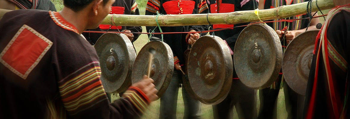 The fame of Cultural Space of Gong in the Central Highlands of Vietnam has crossed the national borders to become a prestigious propety of human beings. Specific values of the cultural space of the Central Highlands gong which is a part of Vietnam’s cultural heritage and quintessence has been recognised by the international community. On 25th November 2005, the UNESCO decided to recognize “The cultural space of gong in the Central Highlands” of Vietnam as “Masterpieces of the Oral and Intangible Cultural Heritage of Humanity”. Traditional Values of Central Highlands Gong Culture Throughout the Central Highlands of Vietnam, Gong ensembles are parts of various ceremonies and closely linked to the communities’ daily life and the cycle of the seasons. The instruments, measuring 25 to 80 centimetres, are played by men as well as women. The culture space of the Gongs of central Vietnam is about original musical forms, which are performed against the background of the linguistic and ethnic diversity of the region. Diversity is also found in the compositions and customs of the Gong ensembles, in their performance techniques, in the musical genres and in the ritual functions of the gongs. In the realm of Vietnam’s musical instruments, the gongs are very well-known for their outstanding value and regarded as the privileged language bridging humanity and the supernatural world. The gongs are made from a mixture of bronze and silver, with some distinctive features. The peoples living in the Central Highlands of Viet Nam possess many sets of gongs, which would be performed differently. A set of gongs consists of two to twenty units. Photo: zing.vn Cultural Value The most outstanding value of gong culture showcases masterpieces of human creativity. The masters of gong culture are the ethnic people of the Central Highlands. Although they can not cast gongs themselves, they raise the value of a product into an excellent musical instrument with their sensitive ears and musical soul. In the hands of talented folk artistants, each gong plays the role of a musical note in an orchestra to perform different pieces of gong music. As for ethnic minorities in the Central Highlands, gongs and gong culture present a means to affirm the community and its cultural identities. As time went by, gongs have become an attractive and appealing symbol of the culture of the Central Highlands. It is an activity associated with cultural and spiritual life, and beliefs of ethnic people when they are born, grown up and return to the soil. Customs of Central Highlands Gong Culture The Central Highlands gong comes from long-standing historical and cultural traditions. In the past, community of people in the Central Highlands knew how to play the gong. Its sound is either deep or strong, moving and combining with the sounds of streams, wind and the hearts of people so that it can live with the heaven, the earth and people in the Central Highlands.However, different ethnic minority groups arrange different orchestras. Listening to the sound of the gong, people in the Central Highland can know which ethnic group is playing.Gong players in the majority of ethnic groups in the Central Highlands are male. Only in a minority of ethnic groups in the region, gong players are female. Visual description of the Background Picture It is a bright sunny day and a group of men are outside playing brown tambourines. Only five of the seven men are clearly visible. Their bodies describe a semi-circle facing the left of the picture. They all wear calm expressions. Each man holds the tambourine in his right hand, hitting it with a short thick piece of wood held in the left. The tambourines all have white characters written on them. All the men are wearing the same costume: a dark-blue long-sleeved shirt with multicoloured cuffs and a red square piece of material with golden buttons down the front. Some of the men wear caps; the first man from left to right wears a yellow cap, the second from right wears a blue cap. In the background we can see a forest with blue sky just visible through the dense foiliage of the trees. Smoke is spiralling upwards from the dirt floor. On the far left of the frame we can see the entrance to a hut. The Central Highlands’ gongs, together with the epics, the treasure of folklore, folk sculpture and folk knowledge, constitute the unique cultural heritage that have attached to the life of the highlanders for over thousand years. Share: Most Popular Vietnamese Silk Painting Vietnamese Wedding Ceremony Tradition “Banh Chung” (Chung Cake) – The Soul of Vietnamese New Year! Mid-autumn Festival in Vietnam (Full Moon Festive) Vietnamese Traditional Family Values!