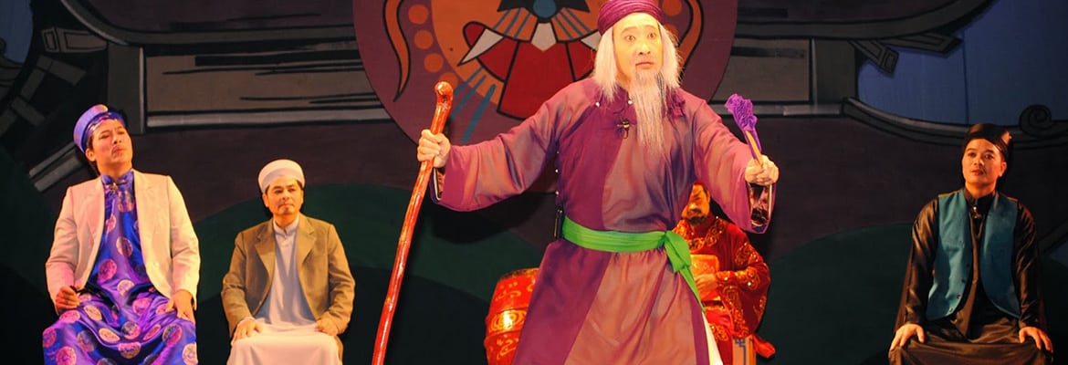 There’s a folk verse in Vietnam that tells about a lazy guy who does not want to do anything but could not resist the attraction of a Cheo play, which has played a very important role in Vietnamese cultural life for a long time and is considered the oldest and most popular folk music performance in Vietnam. When did the Cheo Singing Appear? Cheo singing is believed to have originated in the 11th century, and has its roots in village festivals in the Red River Delta.After crops harvest, the farmers hold the festivals which include a series of activities such as plays, Cheo singing, etc. to exchange the information as well as to make new relationships. Since then, many national Cheo repertoires which are considered treasures of the traditional stage are created, expamples are Truong Vien, Kim Nhan, Luu Binh – Duong Le and Quan Am Thi Kinh… Performance of Cheo Like many ancient performance arts in Vietnam like Xam singing or Tuong, Cheo singing is an oral one with stories composed by anonymous author-performers and orally “passed on” to fellow performers. In this folk art performance, stories which can be legends, poetry, history or even daily life are the most important, “whenever there are stories, we have Cheo”. Also, brought into the play are acrobatic scenes and magic. Cheo tells tales of chiefs, heroes and lovely maidens and offers an eclectic mix of romance, tragedy and comedy. These stories are performed by folk songs with pantomime, instrumental music and dances, combined with instructive or interpretative sketches. Beside the stories, the characters are the soul of a play. Like Tuong, Cheo uses standard stock characters -usually a hero, a heroine and a clown- who are instantly recognizable to the audience. Cheo stories may sometimes be romantic or tragic but the clown or buffoon always comment on the action in an amusing or satirical way as well as to mock pompous, ridiculous or dishonest characters. Providing a link between the performers and the audience, he shoots shafts of satire at evil-doers, such as ignorant witchdoctors, greedy landlords, or arrogant mandarins. {{ pageNumber }} No result A couple of buffoons may appear on stage, for instance, the master in a flowing gown and his servant in a short coat and carrying a stick, each speaking the language and behaving in the ways of his class. The buffoon might perform right at the initial scene of a play, carrying a torch or a megaphone and provoking wild laughter of the audience. The clowns present a comic portrayal of social life, with ridiculous, satirical words and gestures, and reduce the audience to tears of laughter.A Cheo play can not be complete without stage. The play could be put on the stage of a large theatre, but also be performed successfully on one or two bed mats spread in the middle of a communal house. The Cheo drum was traditionally used like a church bell with magical sounds. Upon hearing, villagers cannot resist coming to see the play. The costumes, make-up and gestures are very simple and base on each character of the play. At present, Cheo is an integral part of Vietnamese theatre and attract not only people in the countryside and in towns but the foreign spectators as well. Share: Most Popular Vietnamese Silk Painting Vietnamese Wedding Ceremony Tradition “Banh Chung” (Chung Cake) – The Soul of Vietnamese New Year! Mid-autumn Festival in Vietnam (Full Moon Festive) Vietnamese Traditional Family Values!