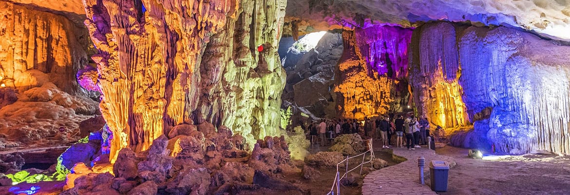 Home to about 1,600 islands and islets, Halong Bay, a UNESCO World Heritage Site in Quang Ninh Province, Vietnam is also famous for so many unique and beautiful caves. It may make you confused to choose some caves to see. To help you easily determine which one to visit, we reveal 8 famous and magnificent Halong Bay caves and grottoes that are worth visiting at least once in Vietnam. Contents Toggle1. Surprising Cave (Hang Sửng Sốt) – Halong Bay’s Largest Cave 2. Thien Cung Cave – the Gift of Nature to Halong Bay3. Dark and Bright Cave (Hang Sáng Tối) – the Magical Cave made by Mother Nature4. Trinh Nu Grotto (Hang Trinh Nữ) – the Symbol of Love5. Dau Go Cave (Wooden Stakes Cave) – the Cave of Wonders6. Me Cung Cave (Maze Cave) – the Maze of Beauty7. Luon Cave (Hang Luồn) – the Paradise of Magnificent Nature Landscapes8. Tien Ong Cave – a New Cave to Be Included in Your Itinerary 1. Surprising Cave (Hang Sửng Sốt) – Halong Bay’s Largest Cave Located in Bo Hon Island, Sung Sot cave is the largest and one of the most beautiful caves in Halong Bay. It is where you can find many rocky islands concentrated in different strange and distinct shapes. The first thing you may think when setting foot in the cave is that it is just a very small area. However, you will be surprised after passing through the rocky slot and go inside. The area is so huge, stretching about 10.0000 square meters in width. Many tourists are surprised by its majestic beauty and the huge expansion. Maybe that’s the reason why it is called “Sung Sot Cave” or “Surprising Cave”. The cave is divided into 2 main areas. The first one gives you an impression of entering an immerse theatre whose ceiling is covered by stalactites and stalagmites. The second one is a different space. Its ceiling is covered by many stalactites and stalagmites, which looks like a silky “velvet carpet”. {{ pageNumber }} No result 2. Thien Cung Cave – the Gift of Nature to Halong Bay (source: klook) Located just 4 km from the harbor, Thien Cung is the most interesting and legend-filled cave which is considered as a unique winding pathway through the “Heavenly Palace”. 27 meters above sea level, visitors must climb 90 rocky steps to the mouth of the cave. The cave is well-known for its complex interior structure, high ceilings, and multi doors. There are three large chambers in the cave, each containing imposing displays of stalactites and stalagmites. They have various sizes with strange shapes such as fishes, birds, and celestial maidens. Thien Cung cave is also famous for its legend about an ancient Dragon King. He defeated invaders and returned to his cave instead of getting an award. Dragon Prince married to a girl whose name is May. Their wedding was held in the cave with the attendance of many dragons, giant eagles, and huge pythons. Going around the cave, you can see this scene engraved on the wall and stones. {{ pageNumber }} No result 3. Dark and Bright Cave (Hang Sáng Tối) – the Magical Cave made by Mother Nature (source: vspiritcruises) If you are looking for a less populous cave, this is the place to go. Close to the border Lan Ha Bay and just about 1 km away from the Surprise Cave, the Dark and Bright cave is only accessible by rowboating or kayaking. Compared to other caves in Halong Bay, it is equally beautiful and there is a variety of animals and plants within the ecosystem. Right from the entrance, you can see many fig trees and orchids around. Behind the entrance, there are plenty of huge trees and fragrant flowers. And in the lake are different types of organisms such as crab, shrimp, and corals. As its name suggests, the cave is divided into two parts: the Dark cave and the Bright cave. The Dark cave is huge with little light, which brings a mysterious beauty to the place. In contrast, inside the Bright cave, the sunlight shines through the cave from the entrance till the end, making it one of the best caves in Halong bay. Coming to Dark and Bright cave, there are plenty of interesting options for you to do. You can take part in many water activities like: sit and bathe on the beach, swim and snorkel to discover the marine life, or go kayaking to explore the beauty of the scenery. Especially, for those who are keen on kayaking and exploring nature, you can go through the Bright cave and come to a valley which is so beautiful with spectacular mountain ranges surrounded. 4. Trinh Nu Grotto (Hang Trinh Nữ) – the Symbol of Love Trinh Nu grotto is situated on the island range of Bo Hon and just about 15 km from Bai Chay Beach. While it is home to some fishermen, it is considered the symbol of true love and a romantic place for taking the path of love for young couples. Legend has it that there was once a beautiful fisherman’s daughter. Her family is so poor that it was in service of the fishing zone’s rich administrator. The administrator forced the family to give him the girl as a concubine. However, the daughter refused as she already had a lover. Angered by her refusal, he exiled her to a wild island where she had to suffer from hunger and exhaustion waiting for her lover in vain till death and then turning to stone. Nowadays, when visiting the cave, you still can see the statue of a lying girl with a long hair, and eyes looking towards the mainland. Trinh Nu Grotto consists of three chambers: one as a house with a flat roof, one is 8 meters long and 5 meters wide, and the other is linked by a narrow window. Inside the grotto, there are many stalagmites and stalactites in many different forms creating beautiful carving pictures on the wall. 5. Dau Go Cave (Wooden Stakes Cave) – the Cave of Wonders (source: halongresorts) Dau Go Cave (Hang Đầu Gỗ) is one of the most famous caves in Halong Bay due to its volume and sheer size. The French tourists who first explored the cave called it “Grotte des Marveilles” which means “Cave of Wonders”. And the cave is t